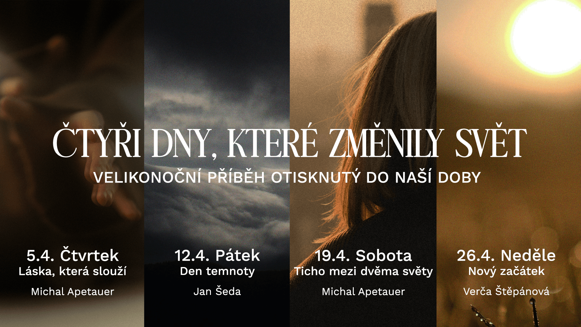 Kolik věcí v životě vypadá jako konec příběhu? Někdy se věci lámou rychle a dostaneme se do stavu, že nevíme, co dál. Někdy se zase lámou pomalu a láme to i nás. A někdy přijde období, kdy člověk jen čeká a neví, co bude dál.Velikonoční příběh drží přesně tuhle realitu. Víra není plochá a prožíváme ji v kulisách různých stavů a emocí: očekávání, radosti nejistoty i naděje. Je to cesta několika dní, ve kterých Ježíšovi učedníci prožili všechno: blízkost, ztrátu, ticho i nový začátek. A právě proto je tenhle příběh tak silný i dnes. Ukazuje, že víra není útěk z reality. Je to cesta, která prochází skutečným životem. V dubnu se podíváme na čtyři dny velikonočního týdne. Čtyři dny, které změnily svět – a možná nám mohou pomoci přerámovat i pohled na náš vlastní život. Připojte se v dubnu k nám!